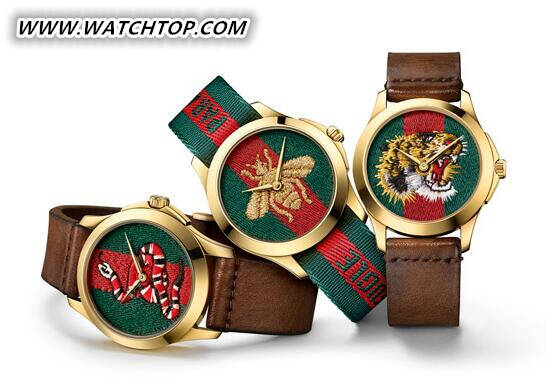 该系列表款风格多样,其中两款腕表搭配柔软的 Toscano 棕色小牛皮表带,尽显简约复古魅力;另有外观更偏运动风的表款,搭配 Gucci 经典"绿红绿"条纹的尼龙表带,诠释洒脱率性。新增表款的表带均饰有 Gucci 的"L'Aveugle par Amour" (执迷于爱) 编织字母,独特醒目,散发摩登都市气息。Le Marché des Merveilles 腕表的与众不同之处在于精致细节:尼龙材质的表盘上运用刺绣工艺呈献标志性动物元素,将蛇、老虎或蜜蜂与条纹背景相互映衬。每款腕表的表壳采用PVD镀金色,或精钢原色。