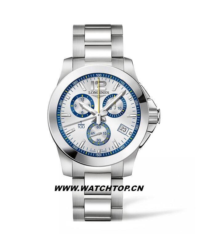 为满足精准的计时要求,浪琴表推出由ETA为品牌独家研发的L440石英机芯。这款机芯带有一个内置闪存的微控制器,能让腕表立即重置时间,并记录中间时间。直径41毫米的精钢表壳,配备无烟煤色表盘,显示时、分,6时位置设有小秒针表盘,并配备日期显示功能与中央计时秒针。2时位置设有30分钟计时盘,10时位置设有12小时计时盘。闪耀于表盘中央的黄色指针用以显示百分之一秒的时间。该款式搭配精钢表链与蝴蝶表扣。