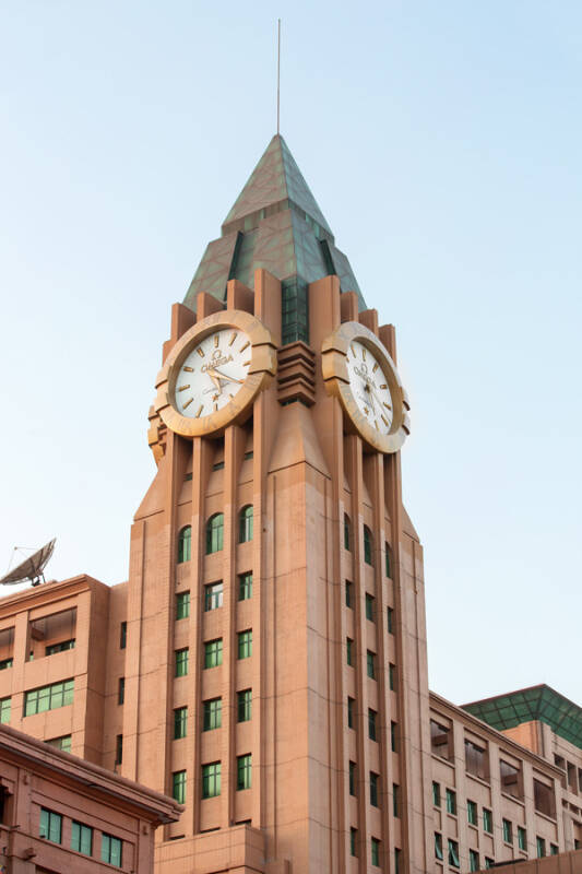 此座亚洲最大欧米茄时钟,钟面直径约7.9米,分针和时针分别长达3米和2.15米。一共4个钟面,每个钟面重达4吨,百米外仍清晰可见。钟楼四面的时钟外观采用与欧米茄享有盛誉的星座系列腕表相同设计,金色表圈上标志性的"托爪"独特醒目;白色表盘配以LED背光显示功能,纵使在夜晚亦可轻松读取时间。