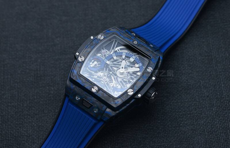 今年宇舶表Big Bang灵魂系列陀飞轮腕表一共推出了两个不同颜色的版本--黑色和蓝色,各限量发行100枚。宇舶第一次在Big Bang灵魂系列的酒桶型表壳中应用碳纤维材质,然后参入黑色或者蓝色,形成十分独特的花纹,视觉效果方面十分出色。
