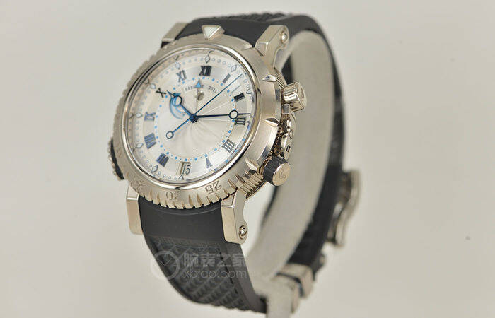 有钱币纹修饰的表壳打磨精致白金表壳侧面采用宝玑经典的钱币纹修饰,细腻精致的纹饰谙合表款硬朗休闲的风格。在表壳侧面还有一枚按钮,可以控制闹铃的启动和停止。腕表潜水表圈上使用阿拉伯数字和坑纹刻度。精致细密的打磨让表壳触摸起来非常舒适。