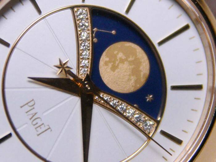 搭载伯爵自主设计、研发和生产的Calibre 584P自动上链机械机芯,设有时、分、秒和月相显示功能。蓝宝石水晶表底盖下,环状缎面磨砂、倒角表桥、日内瓦波状饰纹、蓝钢螺丝,以及玫瑰金色摆铊上的Piaget伯爵徽章纤毫毕现。此外,这款腕表还供有18K玫瑰金版和18K白金版。