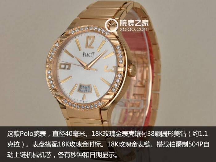 这款Polo腕表,直径40毫米。18K玫瑰金表壳镶衬38颗圆形美钻(约1.1克拉)。表盘搭配18K玫瑰金时标。18K玫瑰金表链。搭载伯爵制504P自动上链机械机芯,备有秒钟和日期显示。