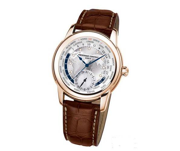 第一款FC-718MC4H4,机芯上镌刻着Perlage和CtesdeGenve纹饰,与腕表上银色悦目的表盘,互相辉映。表盘中央的guilloch纹饰,围绕着黑色指针,罗马数字刻度,彰显典雅魅力;特大日期副盘置于六时位置,并配有24小时显示轮盘,备日与夜显示。在ClassicsManufactureWorldtimer的表盘外圈上,同一时间显示了24个城市,一瞬间让你掌握环球时刻。最后亮丽的黑色或深棕色小牛皮带及玫瑰金带扣,勾勒出奢华的氛围。另一个款式FC-718WM4H4,不同之处在于银色的世界地图,装饰表盘的中央,丰富了整体构图。