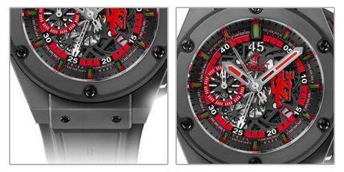 宇舶表一向以大胆和张扬为名,此款延续了品牌一贯的风格,采用多层复杂表盘结构,48 毫米表壳构造出强悍的角度。这一款腕表的分针、9点钟位置的计时器和4点钟位置的日历窗口都使用了醒目的红色,腕表的3点钟位置还印有著名的略带一点叛逆色彩的红魔标志,红黑相间的表盘带来雄浑力度之感,展示着男士成熟的魅力。
