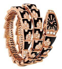 美丽而危险,这也许就是蛇与美女的奇异关系。很少有女人喜欢蛇,但也很少有女人不喜欢蛇皮包和蛇形的装饰。Bulgari著名的蛇形女表系列Serpenti有着60年的历史,Serpenti是意大利语中的蛇,同时它也象征着永恒的青春。该系列一直深得女士的喜爱,今年再推双环缠绕的黑色与白色珐琅镶钻款,更是将美女蛇表演绎得奢华而性感。其复杂的工艺也令人叹为观止,手镯部分以玫瑰金打造完成后,需先以专用工具镶上冷却的珐琅,接着再镶嵌明亮切割式钻石,然后工匠以画笔均匀铺开珐琅,最后再滴上透明珐琅尽管内部结构复杂,手镯的圆弧曲线仍能保证与手腕完美贴合,达到灵蛇缠绕腕间的效果。表款搭载BVLCalibreB303瑞士石英机芯,表圈上下各镶嵌三颗明亮切割钻石,黑色蓝宝石或白色珍珠母贝表盘上的12个时标上另镶有33颗明亮式切割钻石,双圈款手镯部分则镶嵌了总重3.46克拉346颗明亮式切割钻石。