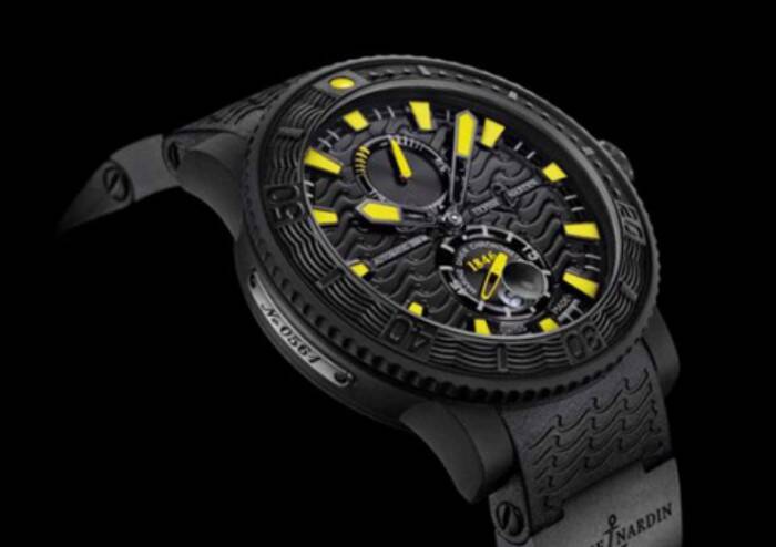 这款雅典航海潜水腕表造型前卫,是一款全天候坚固的运动潜水时计。采用了45.8毫米直径特别处理的不锈钢表壳,表壳经过一个复杂的硫化过程(Vulcanization Process),表面覆盖一层哑黑色橡胶涂层。